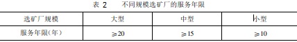 選礦廠的服務年限按礦山可靠的礦床工業(yè)儲量進行計算。它與選礦廠的規(guī)模有密切的關系,一般可參照表2確定。